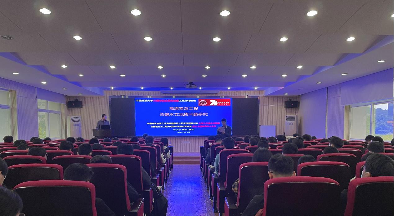许汉华高级工程师作了题为“高原岩溶工程关键水文地质问题研究”的学术报告,内容涵盖高原岩溶水基本特征、自然地理及工程概况、区域地质与库区地质构造、岩溶特征与机制、尾矿库稳定性和尾矿库渗漏岩溶水运移路径等。他通过具体工程案例,展示了云南高原岩溶的基本特征概况;结合区域地质与某尾矿库区地质构造分析,探讨了岩溶发育特征与形成机制;展示了云南某岩溶地区尾矿库稳定性数值方法研究;并对尾矿库渗漏岩溶水运移路径进行了分析探讨;最后总结了区域岩溶和洼地的主要特征,并提出了下一步工作展望。许汉华高级工程师的报告非常精彩,报告厅座无虚席。报告结束,师生们对许汉华高级工程师的讲座报告报以热烈掌声。