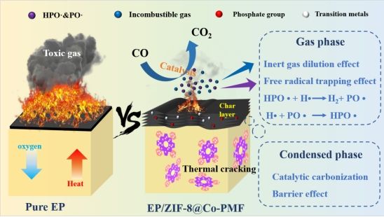 本论文以卟啉基有机框架为基体、ZIF-8为壳层,成功合成了新型有机-无机杂化阻燃剂(ZIF-8@Co-PMF),得益于过渡金属的催化炭化、致密炭层的屏障作用、含磷自由基的捕获效应和不可燃气体的稀释作用,环氧树脂复合材料(EP/ZIF-8@Co-PMF)的热释放率峰值降低31.2%,总烟释放量减少17.6%,CO释放率峰值下降80.2%,大幅提升了环氧树脂复合材料的防火安全性。