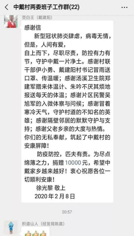“为尽点绵薄之力,捐赠10000元,希望中戴家乡越来越好!衷心祝愿各位一切顺利安康!”2月7日晚上,汤溪镇中戴村党支部负责人戴建阳收到了一封感谢信和一笔10000元的捐款。捐赠者是我系教授、博士生导师徐光黎老师,他说非常感谢工作人员在居家隔离期间对他们一家的关心和照顾,他希望通过捐赠为家乡的抗疫工作尽自己的一份力量。