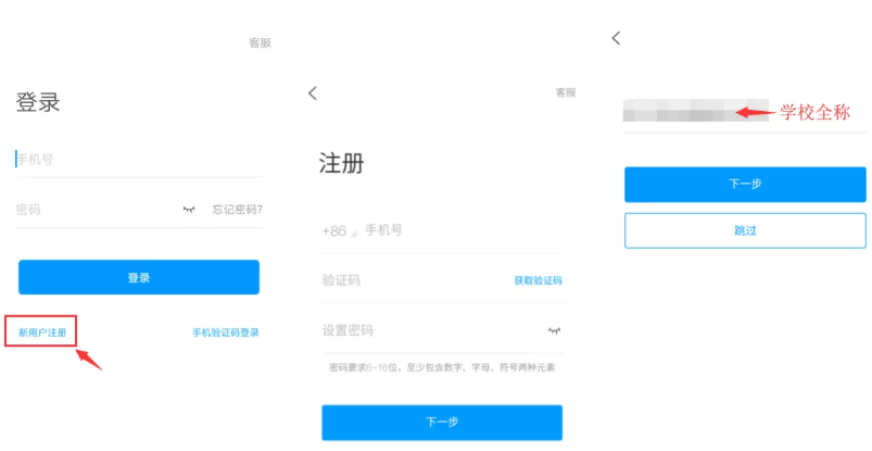 2.用手机号注册账号并根据提示绑定单位账号,已经绑定过的同学可直接用手机号和密码(或验证码)登录。