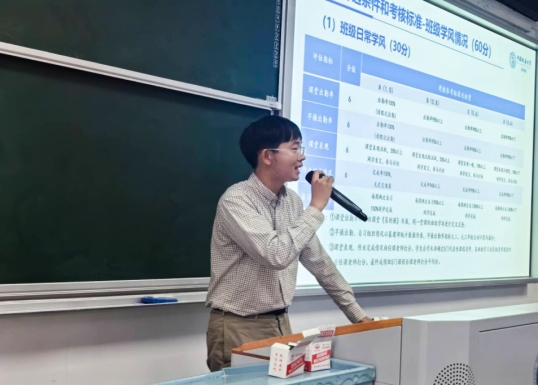 2024级辅导员彭友元介绍《中国地质大学(武汉)开云中国“优良学风示范班”创建评选办法》。他从“优良学风示范班”总体要求、创建流程、考核指标、奖惩办法等四个方面进行介绍,重点解读了班级政治理论学习、遵纪守法与文明修养、集体观念、班级制度建设、班级干部表现等5项班级综合表现指标,课堂出勤、早操出勤、课堂表现、作业完成情况、自习组织情况等5项班级日常学风指标,平均学分绩点、优秀率、及格率和英语四级通过率等4项班级课程成绩指标,以及学生参加科技创新活动等附加分项目指标。他要求同学们仔细阅读创建办法文件,对照量化评估考核指标,积极开展富有班级特色的学风建设活动。